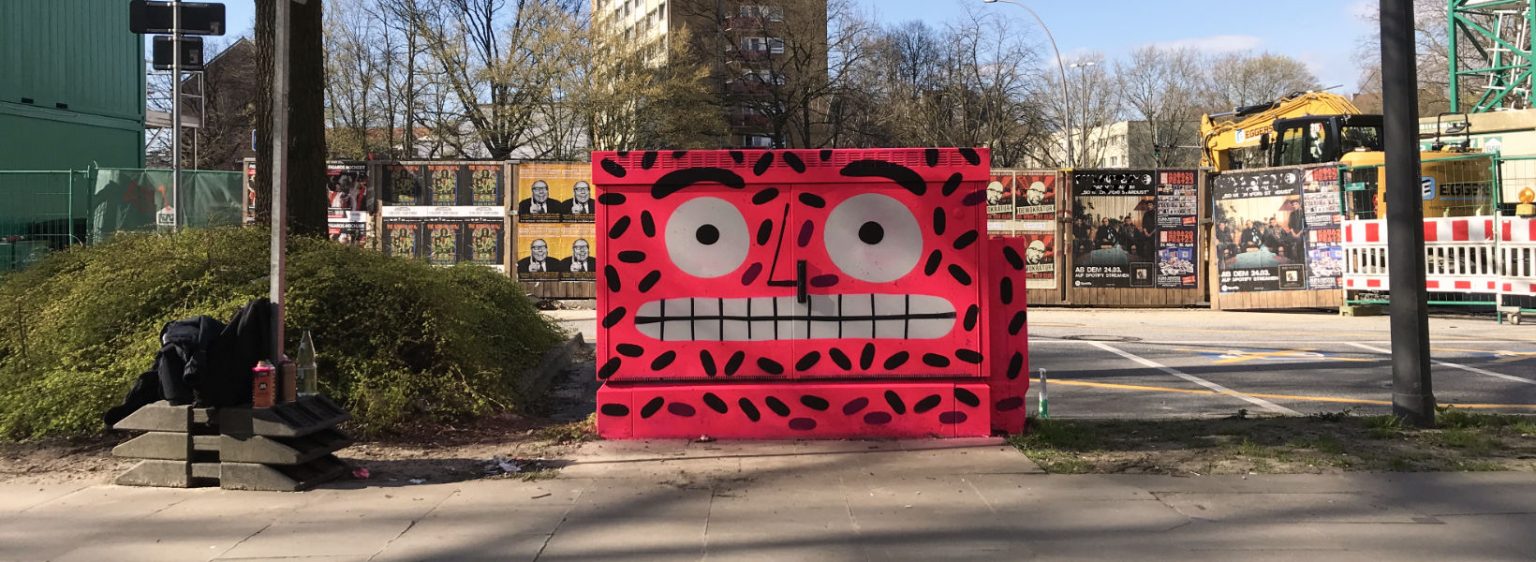 Knallbunt sollte es werden, mit Farben, die lange halten. Der bemalte Kasten fällt dadurch auf und hebt sich deutlich von seiner grauen Umgebung ab. Die Gestaltung orientierte sich an klaren Formen und kräftigen Farbfeldern, sodass das Motiv auch aus der Entfernung gut erkennbar ist.